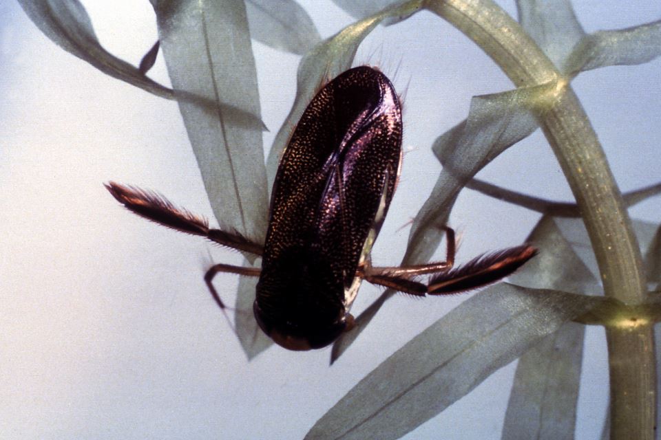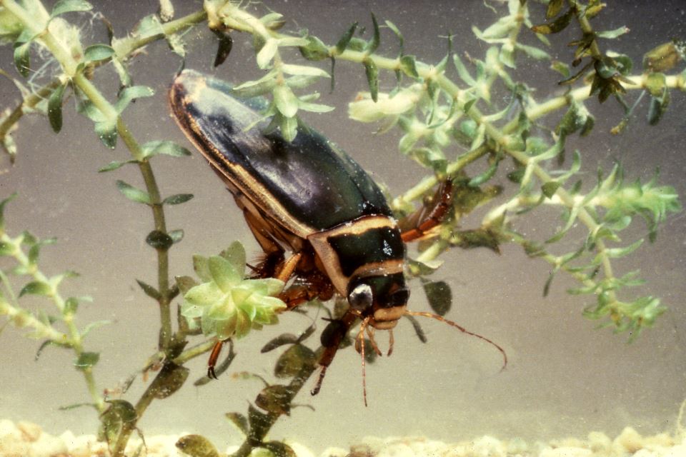 The Horse Leech Haemopis sanguisuga can also be found in Lundy freshwaters. Insects, both adults and larvae, are the most diverse group, with water bugs (Hemiptera) and water beetles (Coleoptera) well-represented. Water boatmen, the smaller Corixids and the larger Notonectids and the Dytiscid diving beetles are frequently found. Other notable forms include the larva of the May fly Cloeon dipterum, the Blue-tailed Damselfly Ischnura elegans, the Common Darter dragonfly Sympetrum striolatum, the caddisfly Limnephilus vittatus and Chironomid midge larva. Few molluscs occur in the acidic Lundy ponds.